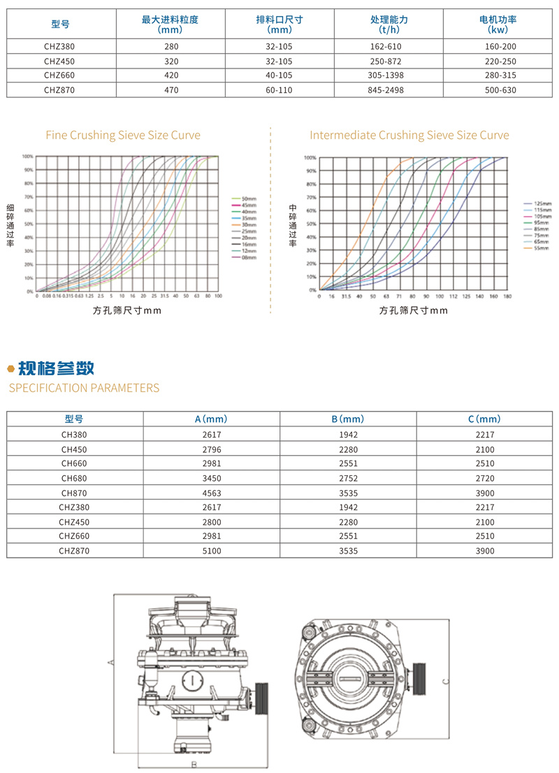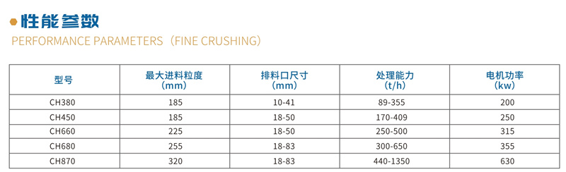 可破碎较为坚硬的岩石,同一主机通过更换衬板即可取得多种腔型,从而适应各种应用场合。中碎型拥有稳定而较大的给料口,用于物料的二级破碎(甚至粗碎)。